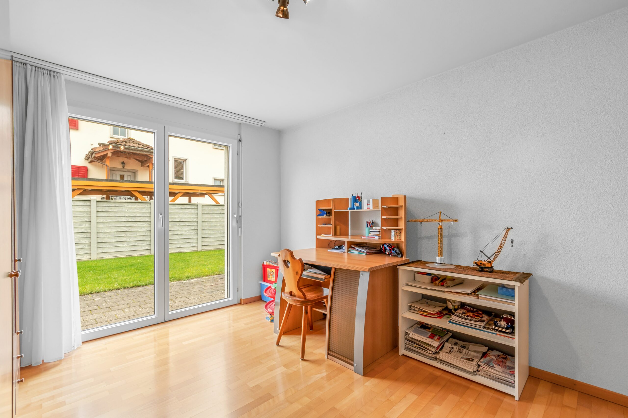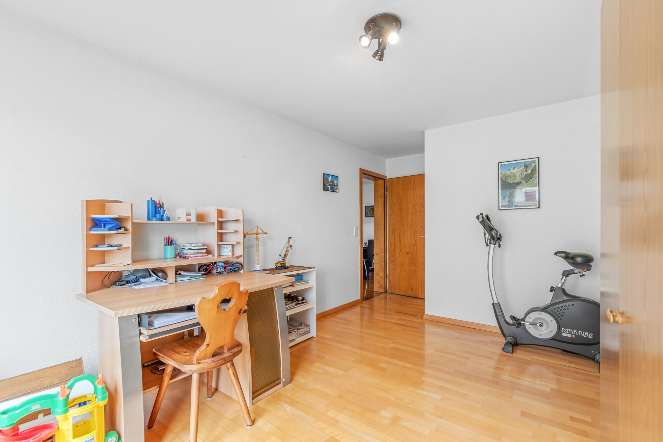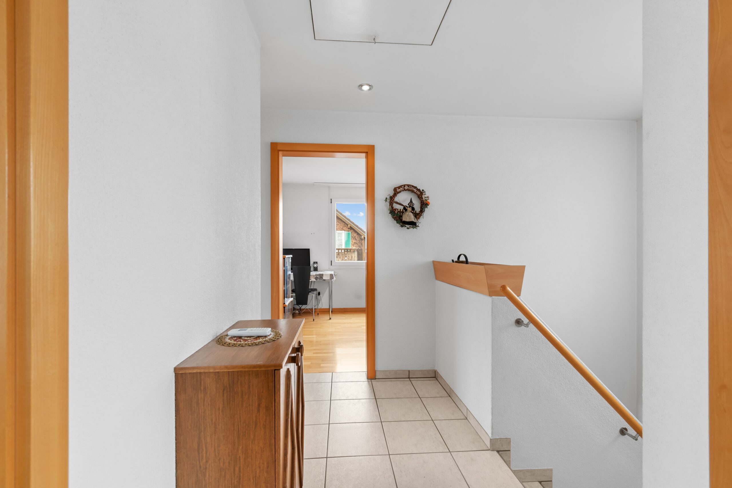 Im Erdgeschoss befindet sich ein gemütliches Wohnzimmer, eine moderne Küche mit Essbereich sowie ein Gäste-WC. Im Obergeschoss erwarten Sie drei Schlafzimmer und ein Badezimmer. Das Dachgeschoss bietet zusätzlich Platz für ein weiteres Schlafzimmer oder ein Büro.